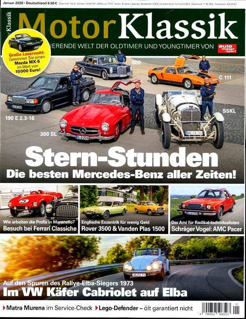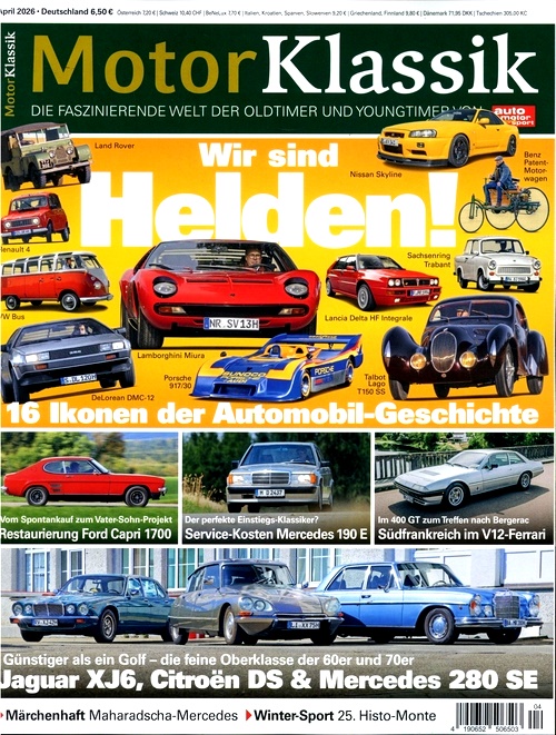 Motor Klassik (DE) är en tidning för alla som älskar gamla bilar. Tidningen berättar om historien, tekniken och kulturen kring oldtimers och youngtimers. Du får läsa om spännande modeller, intressanta personer och fantastiska evenemang. Tidningen ger dig också tips om köp, försäljning, underhåll och restaurering av klassiska bilar. Motor Klassik (DE) är en tidning för dig som vill njuta av bilens gyllene tider.