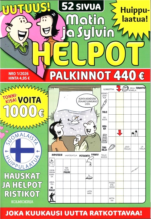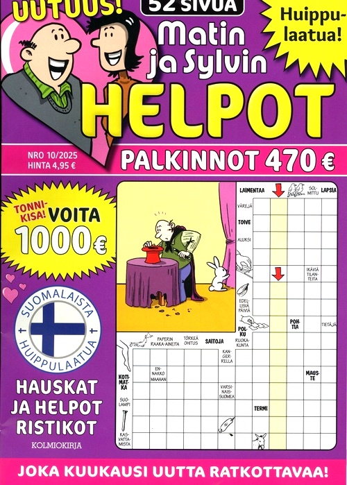 Matin Helpot Ristikot är tidningen för dig som gillar att lösa lätta och roliga korsord på finska. I varje nummer får du 64 sidor med olika typer av korsord, som bildkorsord, ordkorsord och temakorsord. Du kan ha kul med korsorden som har humoristiska och aktuella frågor och svar.