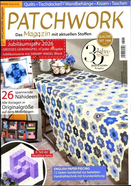 Patchwork Magazine är en tysk tidning som är specialiserad på patchwork och quilting. Tidningen ger dig en omfattande och inspirerande inblick i patchworkvärlden, med fokus på både traditionella och moderna mönster, tekniker och material.