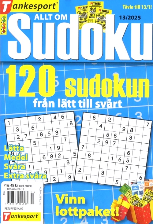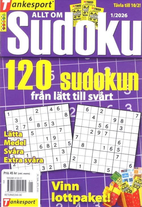 Allt om Sudoku riktar sig till dig som vill hålla igång hjärnan. Varje tidning innehåller 120 olika svåra sudokun. Kört fast? Lugn, alla lösningar finns längst bak i tidningen. Du har också möjlighet att vara med och tävla om fina priser. Formatet är litet och lätt att ta med. Passar utmärkt på resan eller på bussen till jobbet.