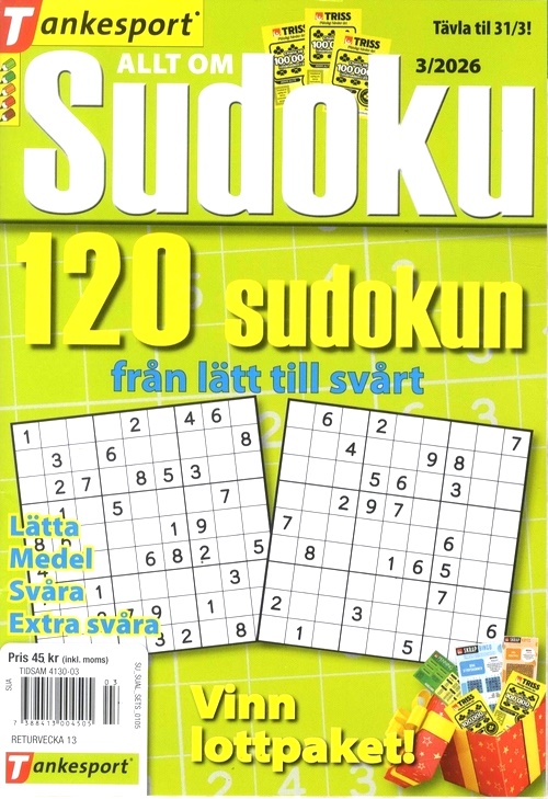 Allt om Sudoku riktar sig till dig som vill hålla igång hjärnan. Varje tidning innehåller 120 olika svåra sudokun. Kört fast? Lugn, alla lösningar finns längst bak i tidningen. Du har också möjlighet att vara med och tävla om fina priser. Formatet är litet och lätt att ta med. Passar utmärkt på resan eller på bussen till jobbet.