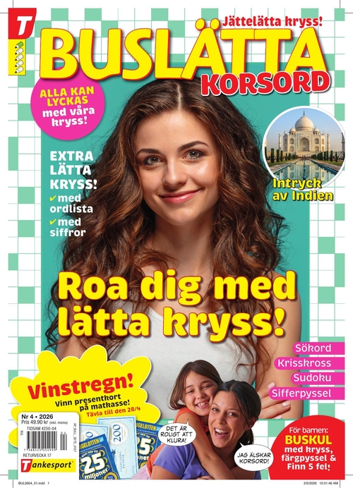 Svårighetsgrad 1 penna Rekommenderad ålder är från 10 år och uppåt, så detta är verkligen tidningen för dig som söker efter en bra aktivitet där du kan inkludera dina barn. Den här tidskriften rekommenderas även för dig som vill utvecklas och lära dig nya svenska ord.500 nr0buslatta-korsord-2-2026.jpg442026-04-01