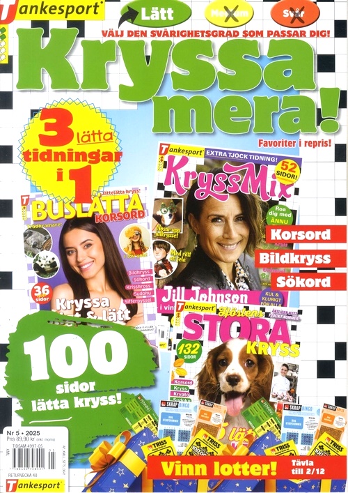 Kryssa Mera Lätt innehåller ett urval ur Tankesports populäraste och mest lättlösta titlar. I denna hittar du kryss och sökord från varumärkena: Buslätta Kryss, Kors & Tvärs samt Sökord.