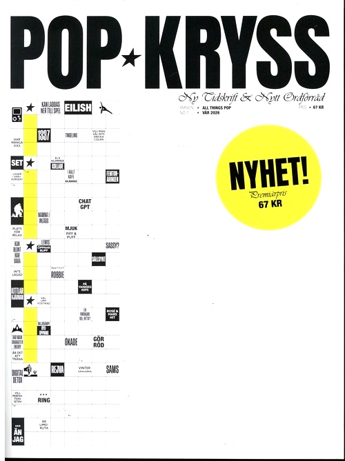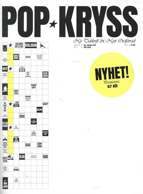 Den nya generationens korsordstidning Pop-Kryss är det självklara valet för unga vuxna som vill ha skärmfri tid. Med kluriga ordlekar, popkulturella referenser och en modern layout levererar tidningen ett helt unikt uttryck. Tillsammans med skaparen av den finska dundersuccétidningen Pop Ristikot blandar Pop-Kryss trender, musik, film, spel och aktuella namn i smarta och lättillgängliga kryss som gör det enkelt att koppla av, tänka till och ha kul. Oavsett om du vill ta paus från mobilspel, ändlöst scrollande eller bara ha något mysigt i handen vid bryggan eller brasan, är Pop-Kryss tidningen för dig.