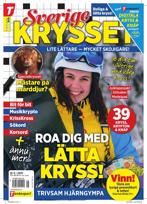 Kan man få för mycket av Sverigekrysset? Nej, det kan man inte! Genom att prenumerera på Sverigelrysset får du en tidning fylld till bredden med härliga kryss, kluriga korsord och fina bilder på allt mellan himmel och jord. Sverigekrysset är en tidning som bjuder på mer än bara hjärgympa! Få massor av inspiration av de goda recepten, var uppdaterad med det senaste inom kändisvärlden, roliga pyssel och få tips på fina ställen att besöka i Sverige. Tidningen Sverigekrysset är en tidning som har lite av varje, men framförallt med fokus på lätta och underhållande kryss att sätta tänderna i.