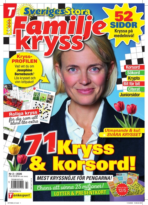 Sveriges Stora är en krysstidning som passar hela familjen. En tidning som innehåller lite av varje; bildkryss, korsord och ordpyssel som är både svåra och roliga. Perfekt för dig som tycker om att utmana dig själv och dina korsordskunskaper! Med en prenumeration på Sveriges Stora får du alltid ta del av nya och aktuella nyheter och händelser inom sport, tv och resor – allt anpassat efter årstiden. Unna dig en prenumeration på familjekrysstidningen Sveriges Stora och njut av avkopplande och underhållande kryss. Svårighetsgrad: 3 pennor
