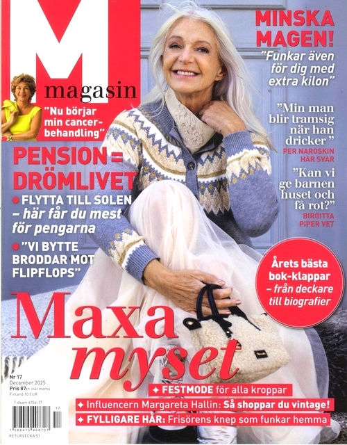 När M-magasin kom tyckte jag att den verkligen stod ut. Äntligen en tidning för oss lite äldre kvinnor. Så känner jag inte längre. Nu 70+ känns det inte som detta är min tidning längre men bra alternativ finns inte. Modet är helt fel, åtminstone för mig. Vill ha praktiska kläder. Sex är färdigpratat. Birgitta Piper superbra! Per Naroskin för det mesta bra. För mycket om era resor. Gör bilaga istället. Är nog en tidning för 50+ och det var väl tänkt så. Mvh Ylva