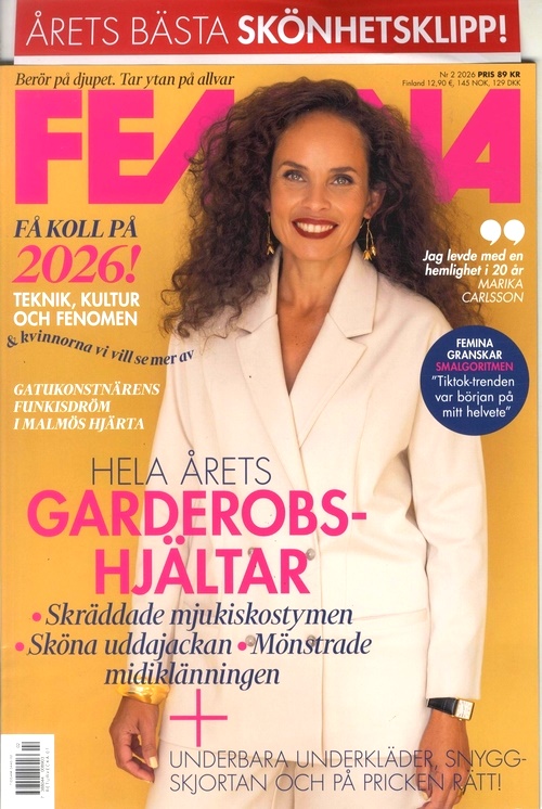 Femina – Sverige största magasin för kvinnor! En Femina prenumeration eller lösnummer ger dig en unik och inspirerande mix av alla möjliga ämnen som vacker och stilsäkert mode, aktuella händelser samt fenomen inom kulturvärlden, berörande och angelägna reportage. Dessutom får du intervjuer med intressanta personer - kända som okända.
