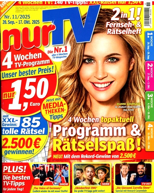 Nur Tv (DE) är en tv-tidning som fokuserar på det väsentliga: det aktuella tv-programmet för de närmaste fyra veckorna. Nur Tv (DE) sorterar programmen efter huvud-, regional- och spartankanaler och ger dig snabba översikter och spelfilm-rekommendationer. Nur Tv (DE) innehåller också ett stort rätsel- och receptdel för den som gillar att lösa kluriga uppgifter och laga god mat.