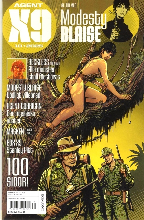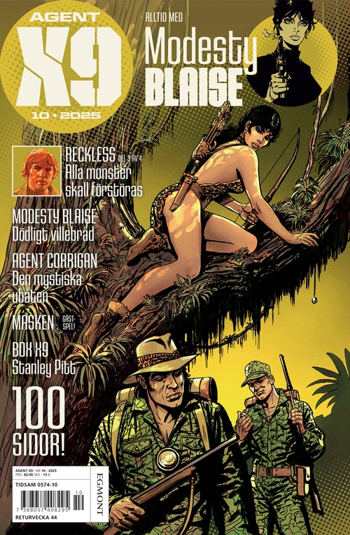 Den smarta och självständiga Modesty Blaise genomför iskallt sina uppdrag på internationell toppnivå. En orädd kvinnlig seriehjälte som aldrig upphör fängsla nya generationer! I Agent X9 hittar du även Agent Corrigan och andra legendariska klassiker, såväl som nya europeiska kvalitetsserier. Agenter, deckare och magiker bildar en spännande mix: Rip Kirby, Niklos Koda, I.R.$. Du får även information om seriernas skapare och tecknare, samt om när och var de klassiska favoriterna ursprungligen publicerades. Agent X9 är den perfekta tidningen för seriefantaster. Varje nummer innehåller 100 sidor spänning.