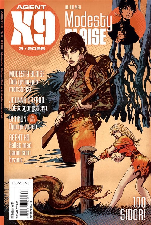 Den smarta och självständiga Modesty Blaise genomför iskallt sina uppdrag på internationell toppnivå. En orädd kvinnlig seriehjälte som aldrig upphör fängsla nya generationer! I Agent X9 hittar du även Agent Corrigan och andra legendariska klassiker, såväl som nya europeiska kvalitetsserier. Agenter, deckare och magiker bildar en spännande mix: Rip Kirby, Niklos Koda, I.R.$. Du får även information om seriernas skapare och tecknare, samt om när och var de klassiska favoriterna ursprungligen publicerades. Agent X9 är den perfekta tidningen för seriefantaster. Varje nummer innehåller 100 sidor spänning.