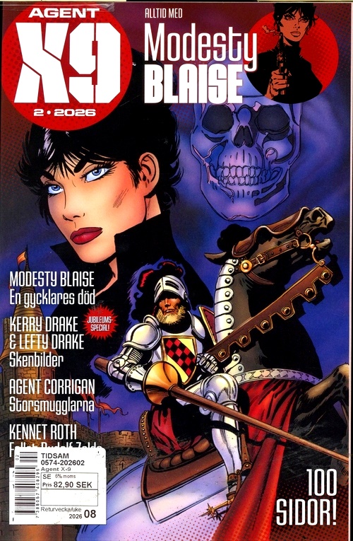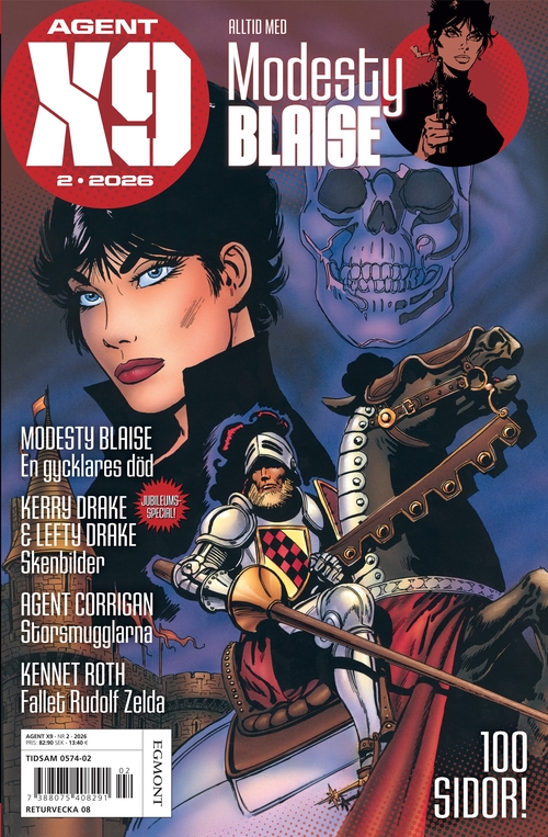 Den smarta och självständiga Modesty Blaise genomför iskallt sina uppdrag på internationell toppnivå. En orädd kvinnlig seriehjälte som aldrig upphör fängsla nya generationer! I Agent X9 hittar du även Agent Corrigan och andra legendariska klassiker, såväl som nya europeiska kvalitetsserier. Agenter, deckare och magiker bildar en spännande mix: Rip Kirby, Niklos Koda, I.R.$. Du får även information om seriernas skapare och tecknare, samt om när och var de klassiska favoriterna ursprungligen publicerades. Agent X9 är den perfekta tidningen för seriefantaster. Varje nummer innehåller 100 sidor spänning.
