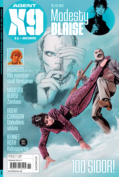 Den smarta och självständiga Modesty Blaise genomför iskallt sina uppdrag på internationell toppnivå. En orädd kvinnlig seriehjälte som aldrig upphör fängsla nya generationer! I Agent X9 hittar du även Agent Corrigan och andra legendariska klassiker, såväl som nya europeiska kvalitetsserier. Agenter, deckare och magiker bildar en spännande mix: Rip Kirby, Niklos Koda, I.R.$. Du får även information om seriernas skapare och tecknare, samt om när och var de klassiska favoriterna ursprungligen publicerades. Agent X9 är den perfekta tidningen för seriefantaster. Varje nummer innehåller 100 sidor spänning.
