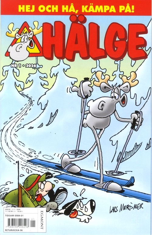 https://www.tidningskungen.se/serier-och-humor/halge56Hälge//bilder.tidningskungen.se/upl/thumb380x500/halge-11-2025.jpg63SEKInStockSerietidningarHälge är en filosofisk och kärlekskrank älg, som med sina sex taggar och ett stort mått list upprätthåller sin status som skogens konung. Han lyckas ständigt gäcka jägaren Edwin, hans hund Blixten och den Rambo-inspirerade jaktpolaren Uffe. Edwins hustru Ellen prövas hårt av makens jaktfascination, men hon hittar också sina sätt att sätta gränser. Förutom gästserier som Pyton, Uffe & Affe, Ottifanterna, Trendz och Djurgården så innehåller tidningen även korsord och roliga vitsar. Tidningen är på svenska.